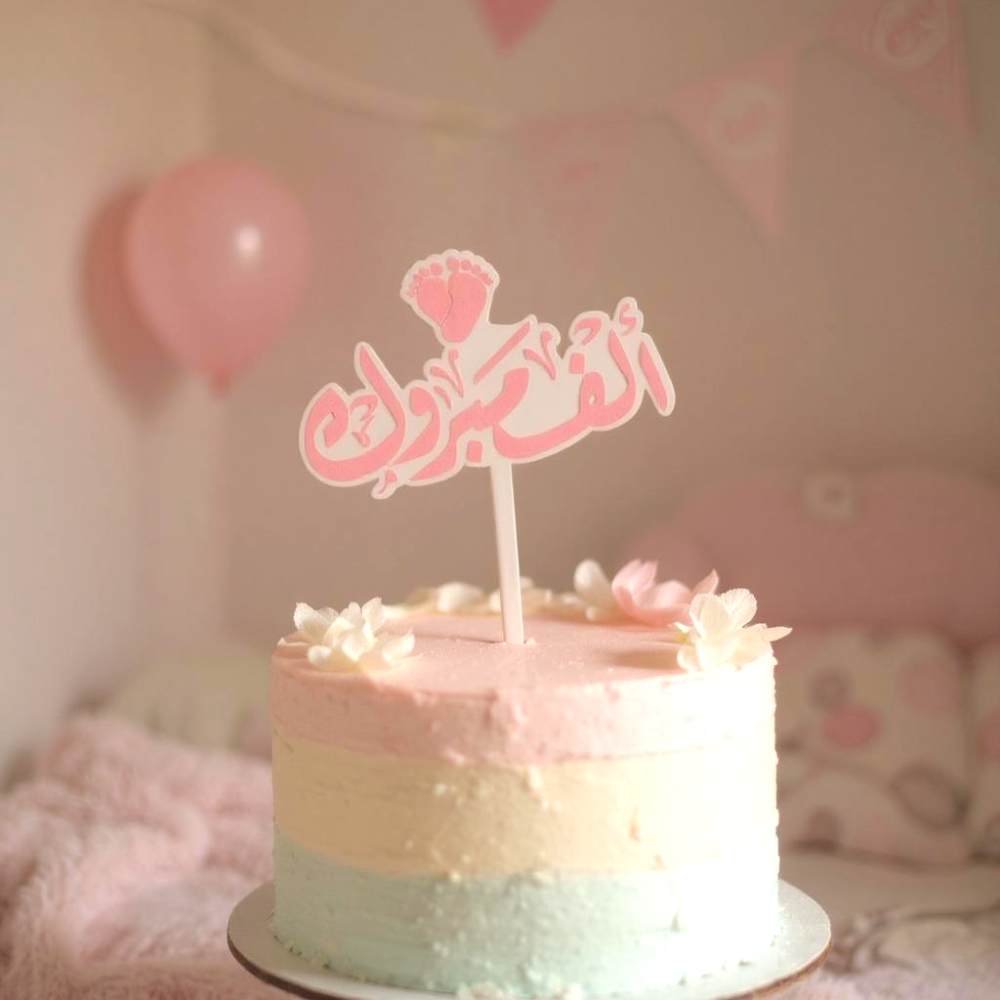 مجموعة مميزة من التغريسات المصممة بعبارة الف مبروك باللون الوردي,اجعل طاولة الحلا مميزة وانيقة مع هذه التغريسات التي تضيف لمسة راقية للحلا المقدم في حفل استقبال مولودك الجديد ,مجموعة التغريسات مصممة لحفلات استقبال المواليد الاناث.