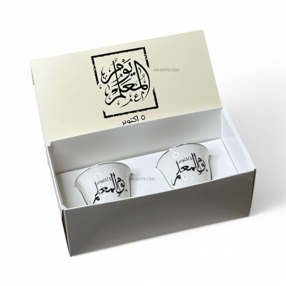 مجموعة (12) من توزيعات فناجين منسقة بعلبة انيقة مصممة بشعار يوم المعلم |توزيعات يوم المعلم