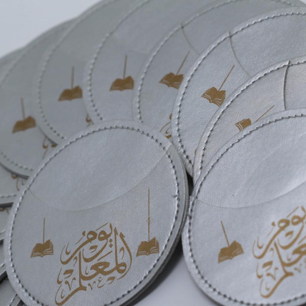 توزيعات جيوب جلد ليوم المعلم/ـة بعبارة يوم المعلم .