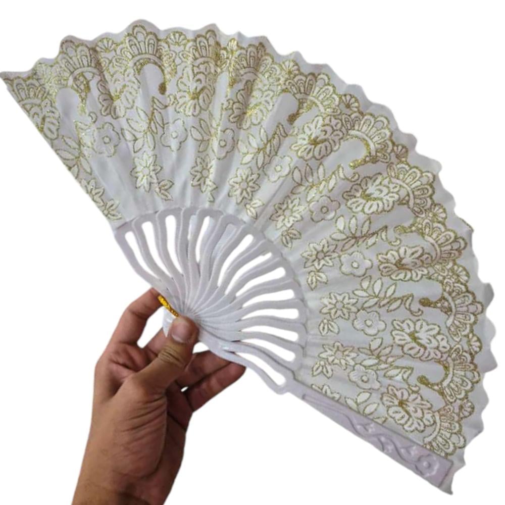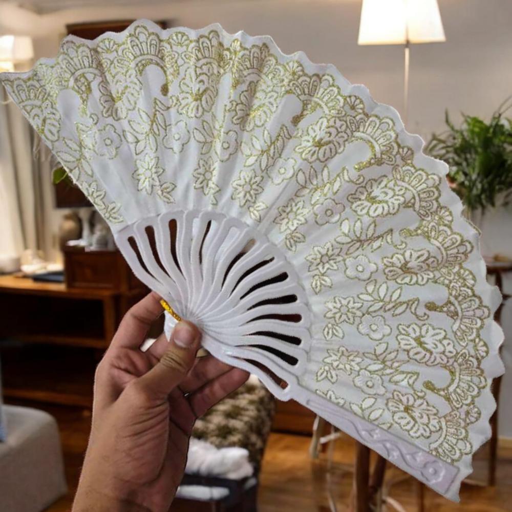 مراوح يد نسائية بتصميم فريد ومميز قابلة للطي بلون أبيض وزخارف ذهبية لامعة .