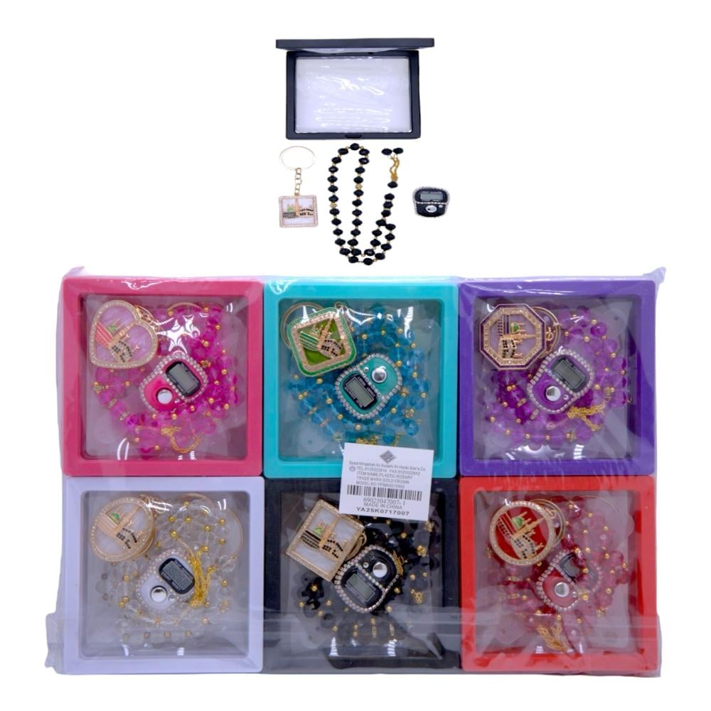 مجموعة توزيعات اسلامية انيقة مكونة من برواز شفاف يحتوي علي سبحة وخاتم تسبيح وميدالية ,المجموعة تاتي ملونة , مجموعة البراويز تعتبر توزيعات دينية مميزة في احتفالات الحج والعمرة والعديد من المناسبات الاخري ,المجموعة مناسبة كهدية فاخرة أو للاستخدام الشخصي فهي مثالية للأصدقاء والعائلة أو إضافة قيمة لحقيبتك الشخصية.