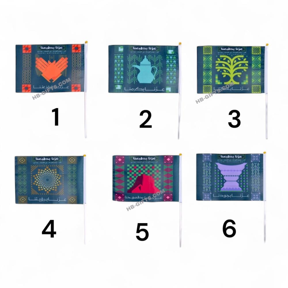 مجموعة (12) من اعلام صغيرة مصممة مع شعار عزنا بطبعنا بخمس مقاسات مختلفة | اليوم الوطني السعودي 95