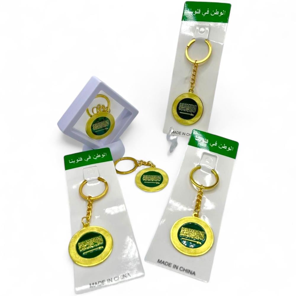 مجموعة (12) من مداليات اليوم الوطني مصممة بشكل علم السعودية بشكل دائري باللون الذهبي والاخضر