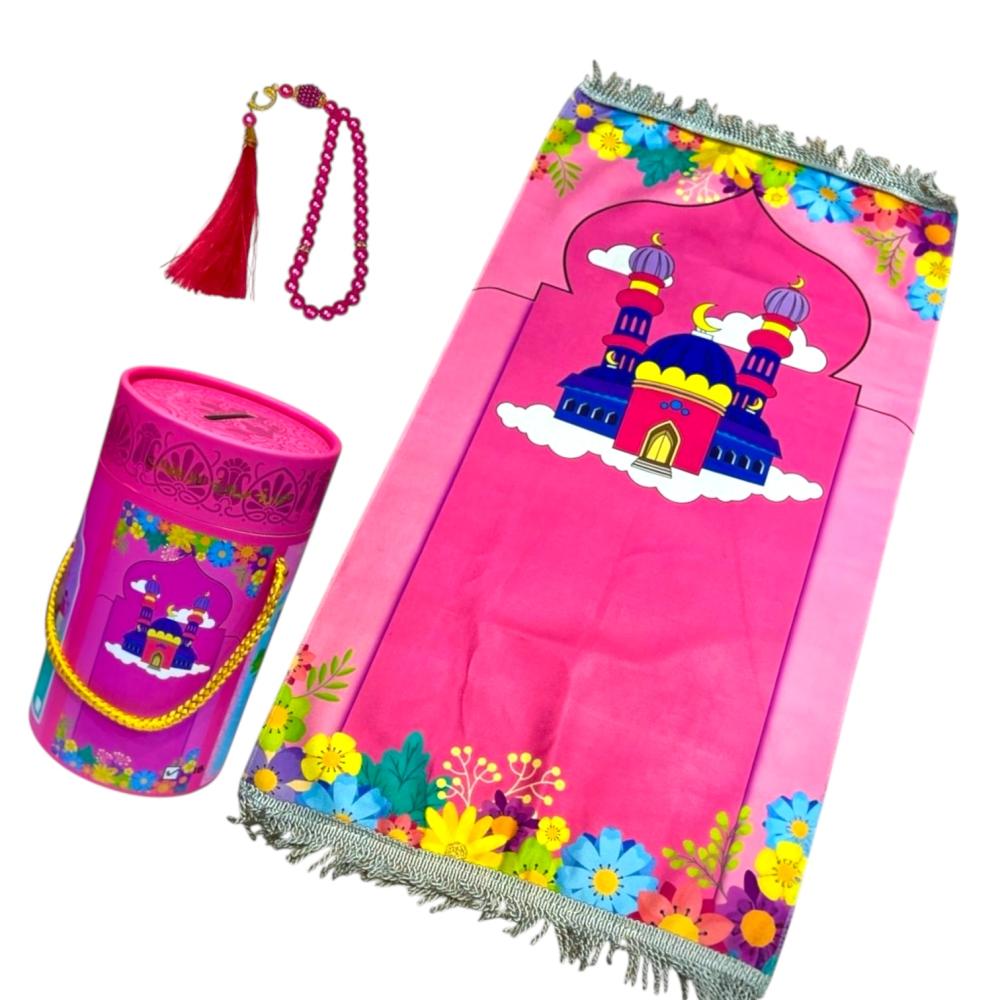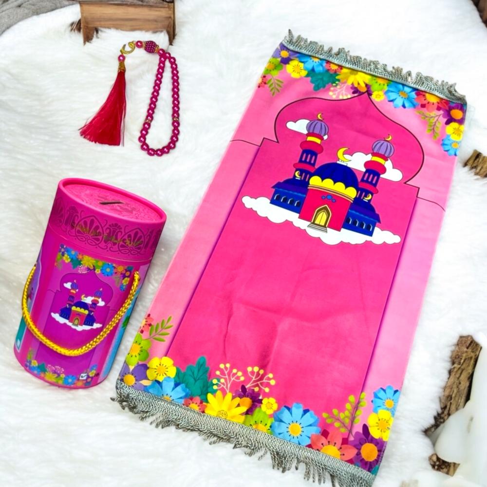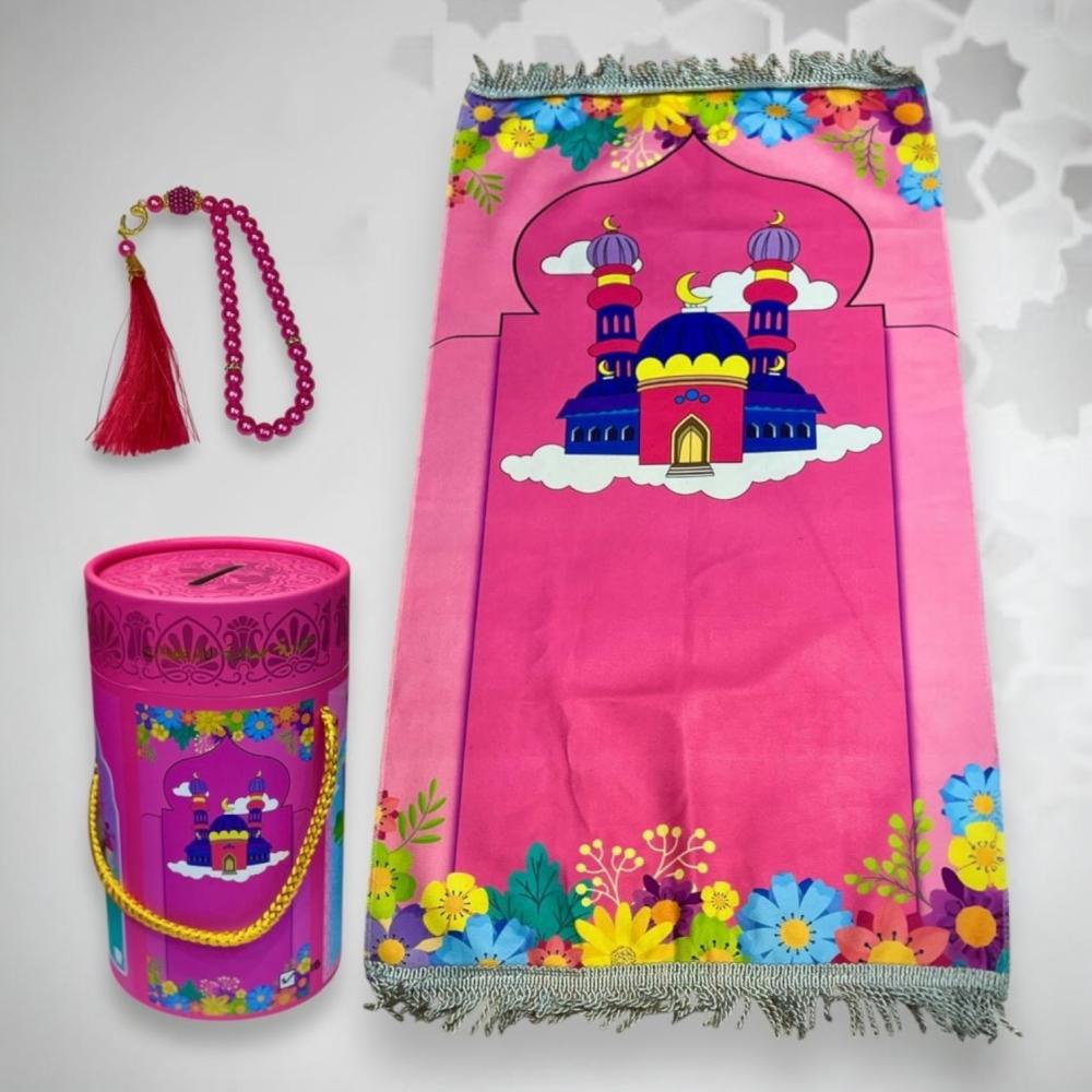 مجموعة سجادة صلاة أنيقة مع سبحة وحصالة للاطفال مصممة بالوان جذابة للاطفال , تعد سجادة الصلاه للاطفال مثالية كهدايا وتوزيعات في المناسبات والاحتفالات العائلية .