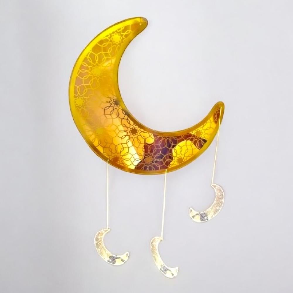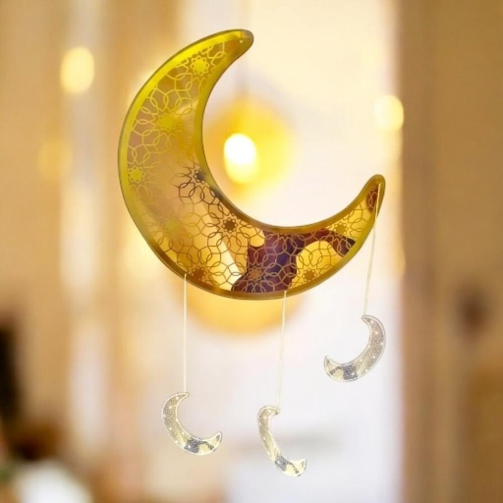 اضف اجواء رمضان مع هذه الزينة المعلقة المصممة بشكل هلال باللون الذهبي و التي تخلق جوا رمضانيا مبهجا .الزينة سهلة التثبيت والتعليق بفضل الحبل المزودة فيه .استمتع بالاجواء الرمضانية مع اهلك واصدقائك طوال شهر رمضان الكريم وزين منزلك بهذه الزينة الرائعة.
