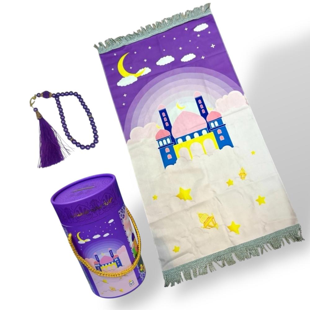 مجموعة سجادة صلاة أنيقة مع سبحة وحصالة للاطفال مصممة بالوان جذابة للاطفال , تعد سجادة الصلاه للاطفال مثالية كهدايا وتوزيعات في المناسبات والاحتفالات العائلية .