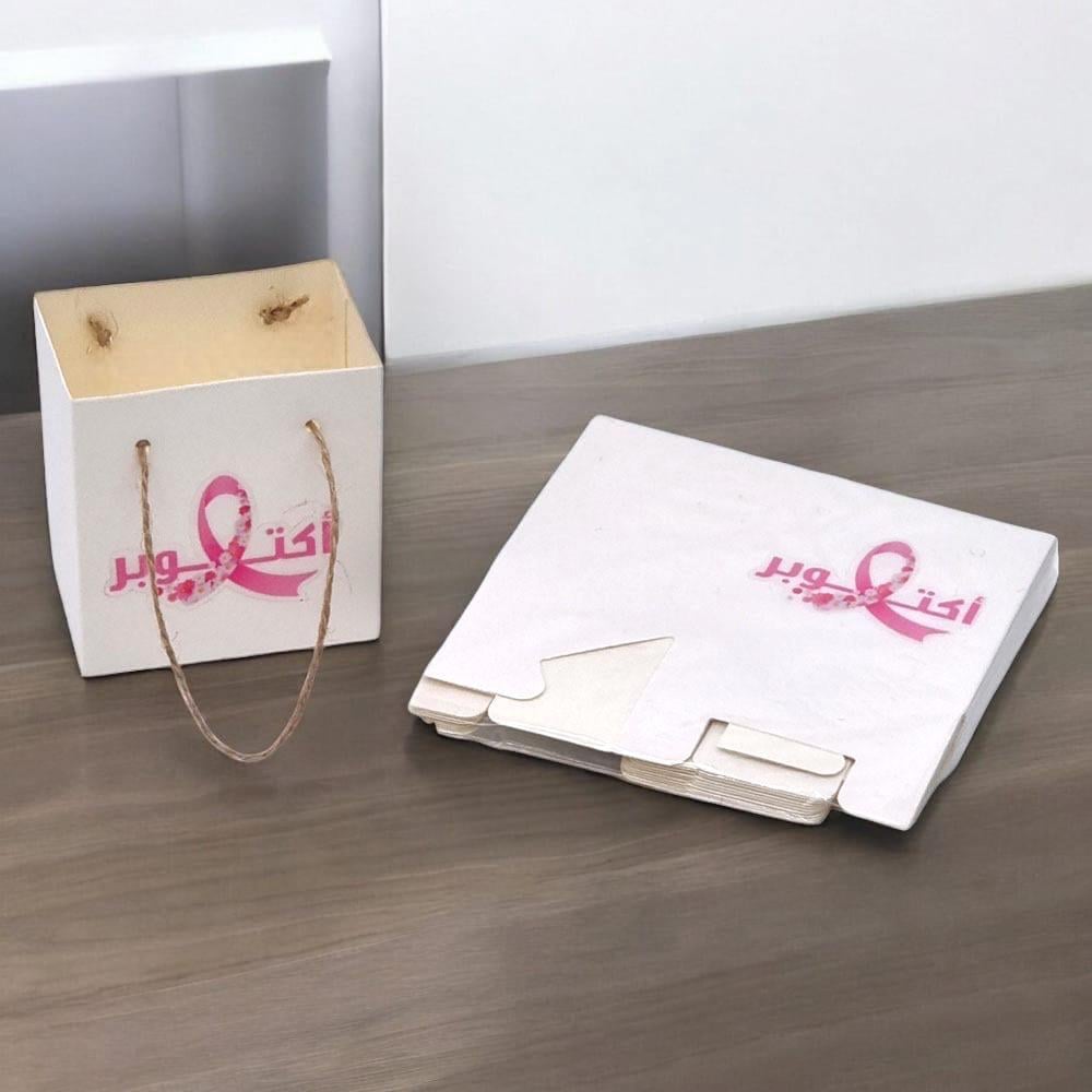 أكياس توزيعات بثيم أكتوبر وفيونكة وردية للتوعية بسرطان الثدي .