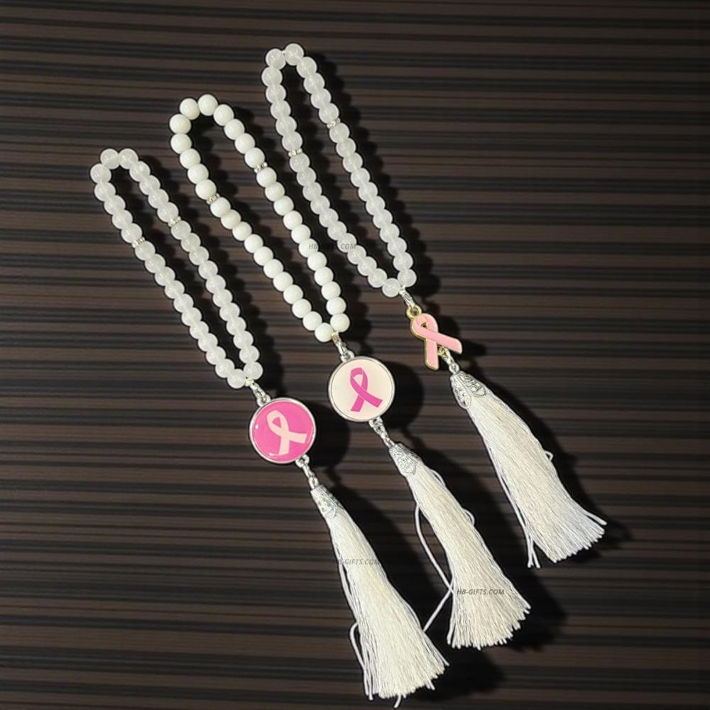 مجموعة من السبح مصممة بتعليقة للتوعية بمرض سرطان الثدي , السبح باللون الابيض والتعليقة مصممة بشكل شعار اليوم العالمي لسرطان الثدي ,تعد مجموعة السبح مجموعة مميزة من الهدايا الرمزية التي يمكن تقديمها في احتفالات اكتوبر للناجين او لمرضى سرطان الثدي لنشر التوعية باهمية الكشف المبكر .