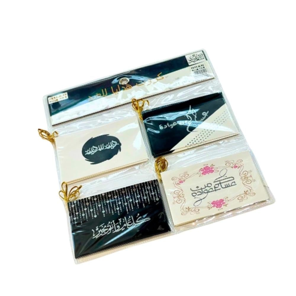 ظروف العيدية مصممة بشكل انيق وعليهاعبارات معايدة متنوعة .