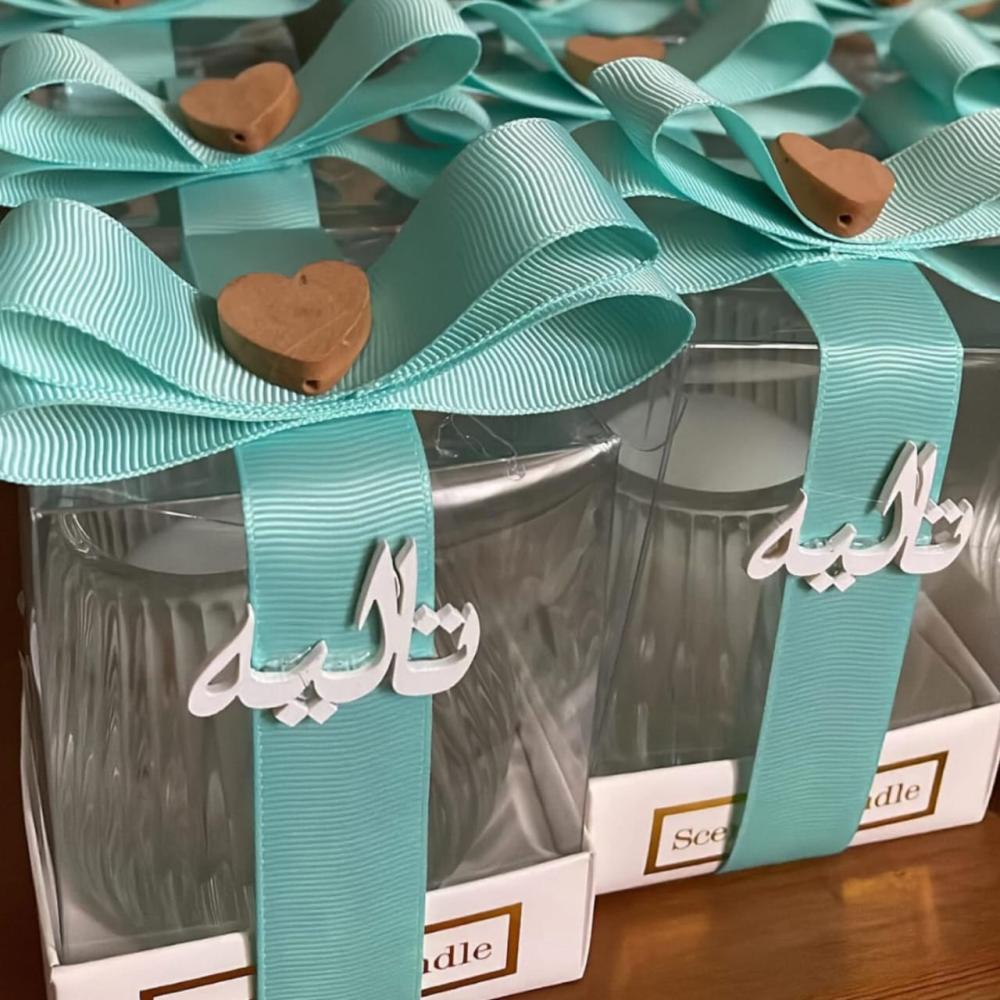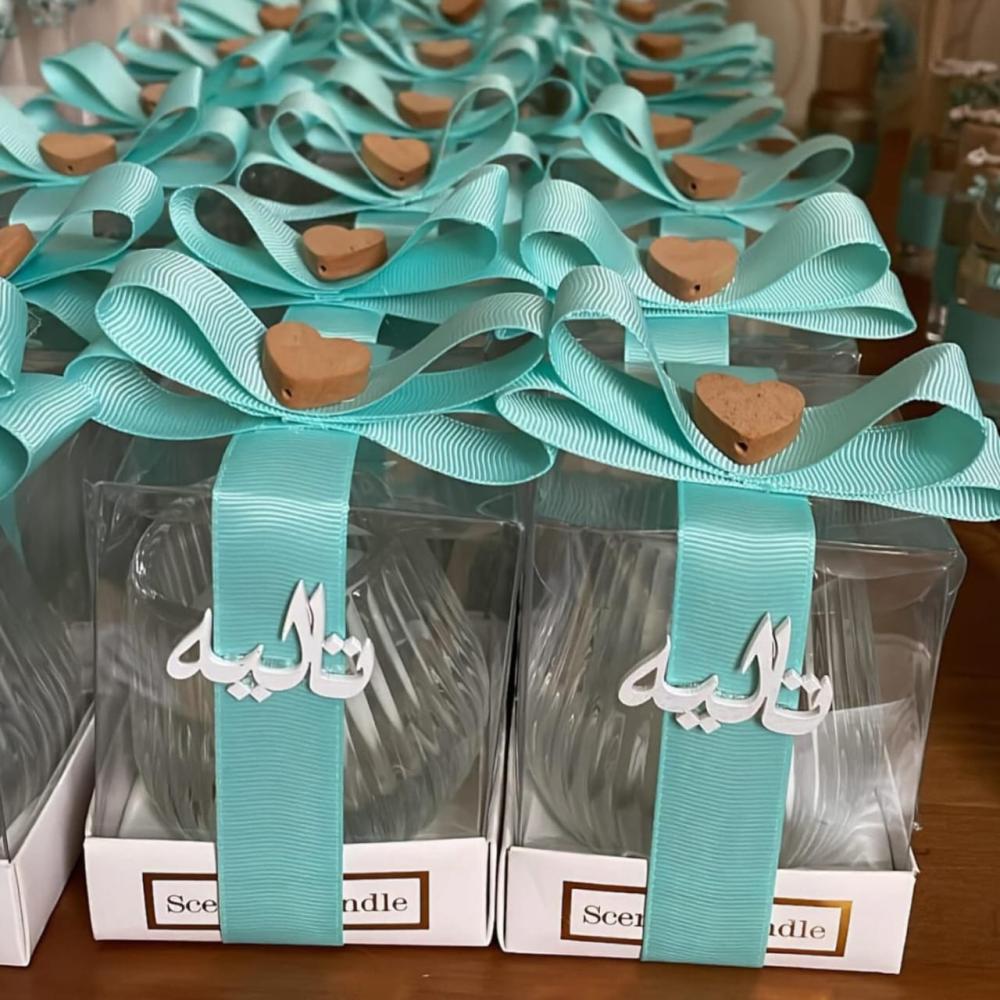 توزيعات شموع معطرة زجاجية (12 قطعة) مغلفة بالشرائط مع كتابة الاسم حسب الطلب