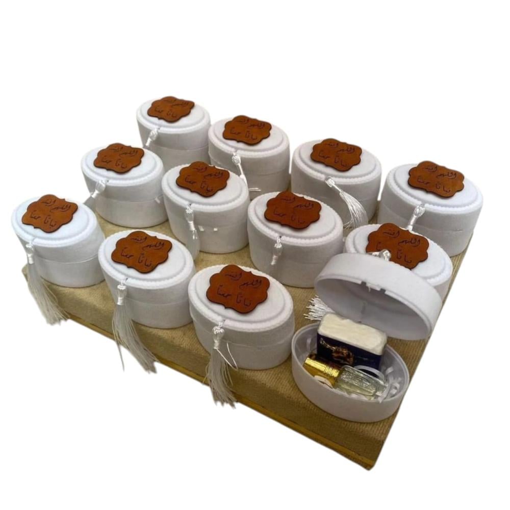 علب التوزيعات مواليد معبئة تولة مسك مخفف و مكعب مسك (12 قطعة) منسق باللوقو مع صحن أنيق