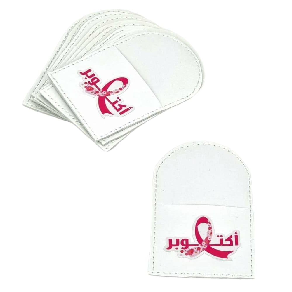 توزيعات جيوب جلد لون أبيض للتوعية بسرطان الثدي حمل رسالة واضحة: 'اكتوبر بتصميم فينوكة وردية.