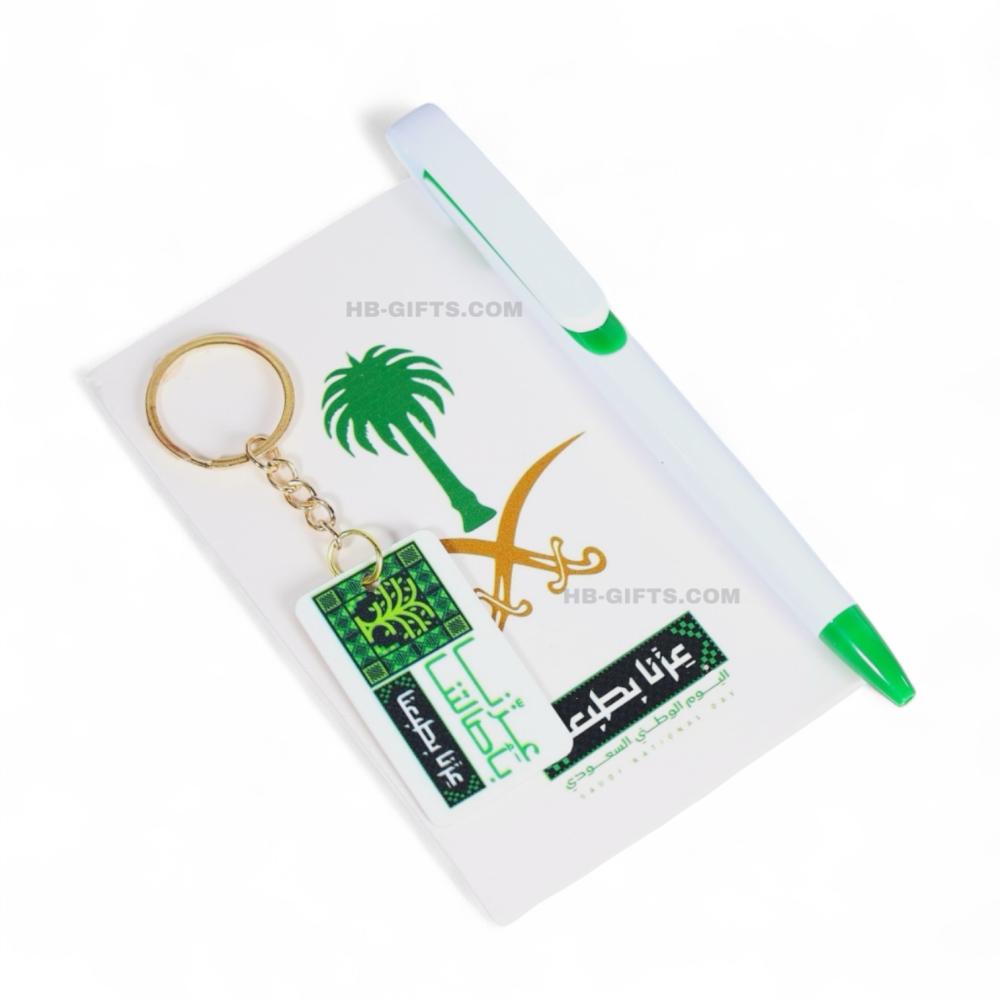 مجموعة (12) من توزيعات كروت منسقة مع قلم ومداليه مصممين باللون الاخضر والابيض وشعار عزنا بطبعنا | اليوم الوطني السعودي 95